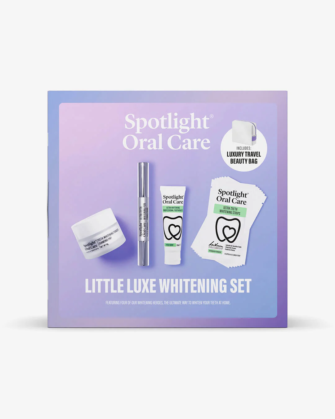 Experience a premium oral care routine with our hero collection to whiten teeth safely at home and on the go, complete with a luxury travel beauty bag. Including our best-selling whitening products, developed by dentists, in travel-friendly sizes, these are ideal for you if looking to top up on your favourites and treat yourself or gift to someone who makes you smile.
